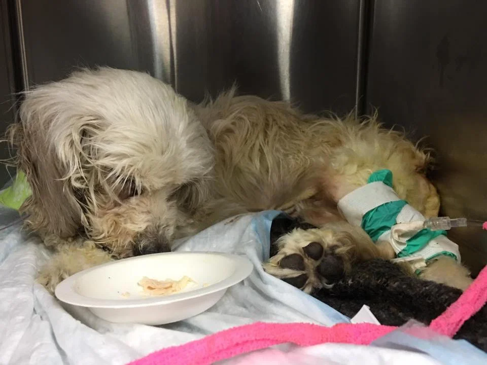 When I saw her lying in the kennel she didn't even have the strength to lift her head. I offered her treats but she could only blink her eyes. I pet her gently and told her I was going to help her.